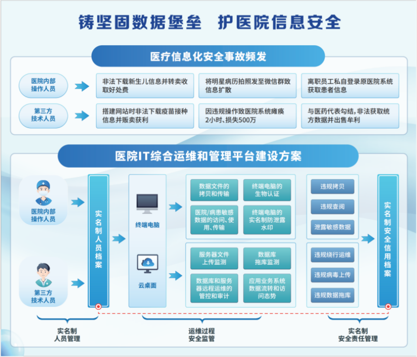 該方案圍繞實名制人員管理、運維過程安全監(jiān)管、實名制安全責(zé)任管理的運維工作全生命周期,通過創(chuàng)新組合實名制生物識別、防泄露水印、運維防繞行、資產(chǎn)智能識別與告警、敏感數(shù)據(jù)檢測等多項自研優(yōu)勢技術(shù),實現(xiàn)對人員、資產(chǎn)、運維、數(shù)據(jù)的嚴(yán)格管控,旨在幫助醫(yī)院建立數(shù)據(jù)全生命周期的安全防護(hù)體系,保障醫(yī)療信息化建設(shè)長治久安。